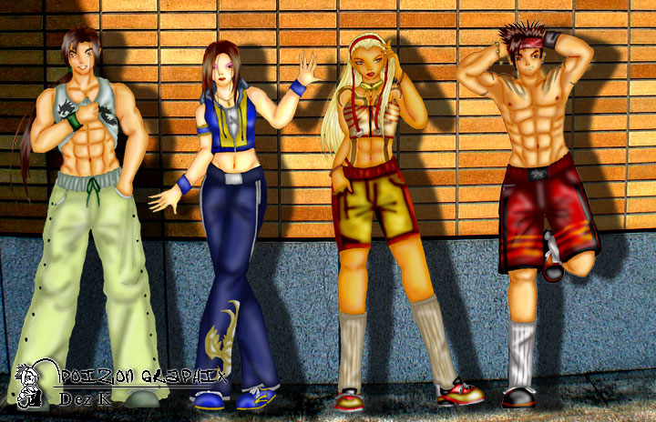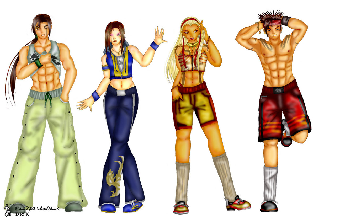 Ink/Adobe Photoshop 5.0: Dynasty Warriors 5 characters in sports wear: Zhao Yun, Zhen Ji, Zhu Rong, and Gan Ning