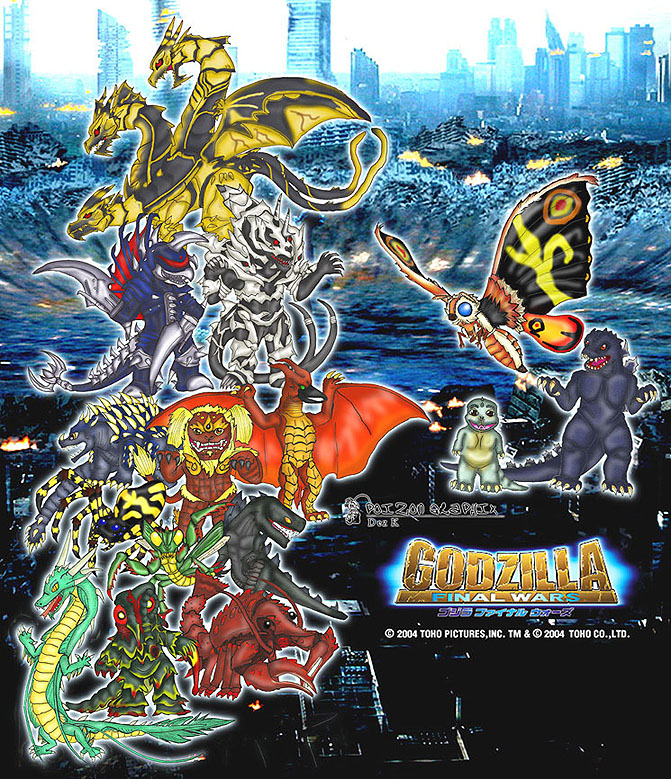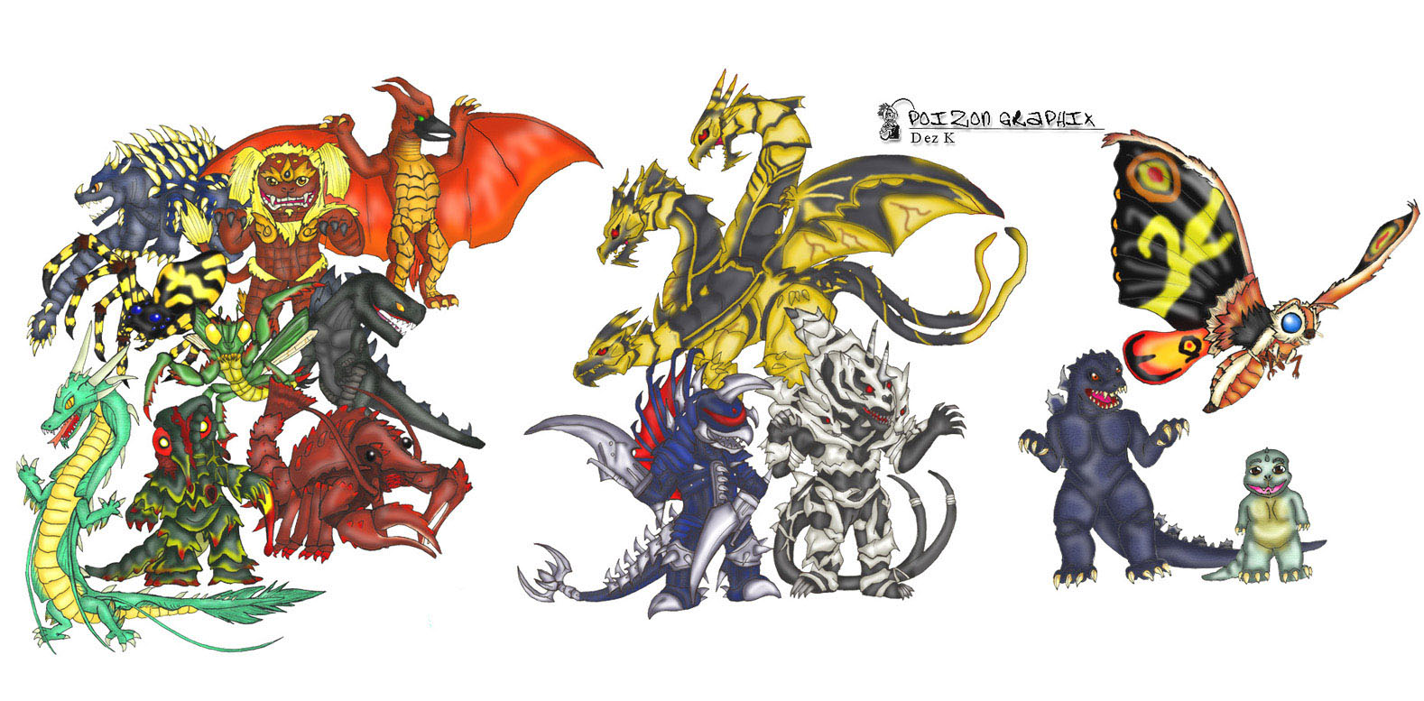 Ink/Adobe Photoshop 5.0: Chibi'd Kaiju from the film "Godzilla Final Wars" : Godzilla, Miniya, Mothra, Kaiser Ghidorah, Gigan, Monster X, Manda, Ebirah, Hedorah, Kamacuras, Kumonga, Zilla, Anguirus, Rodan, King Ceasar
