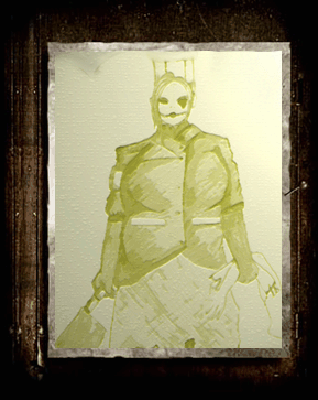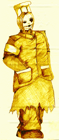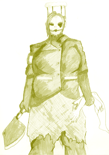 With a massive cleaver gripped to her right,